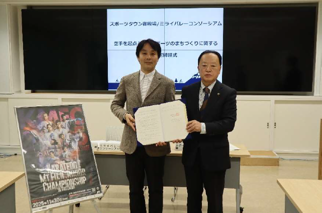 東海国立大学機構名古屋大学が幹事組織を担うミライバレーコンソーシアム(代表:名古屋大学 未来社会創造機構長 佐宗章弘)は、スポーツタウン御殿場推進協議会(会長:静岡県御殿場市長 勝又正美)と、「空手を起点とするスポーツのまちづくりに関する連携協定」を締結しました。